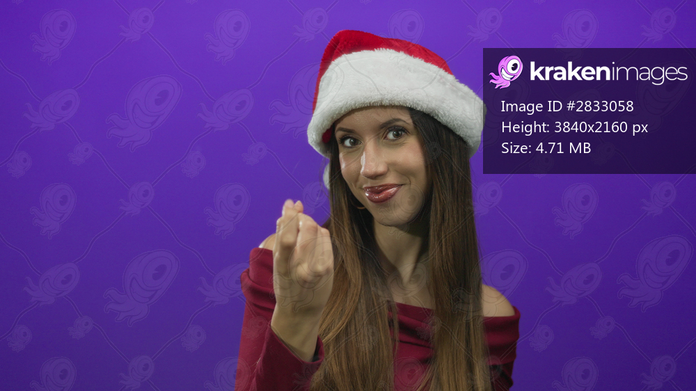 Woman in red santa hat and burgundy off shoulder top beckoning with finger and winking in studio under purple light; playful invitation.