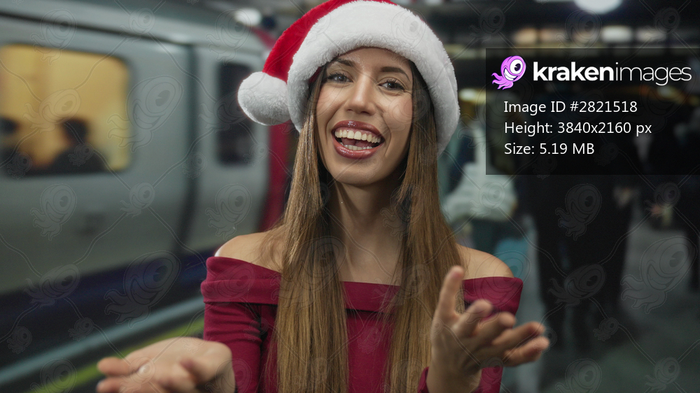 Woman in red santa hat gestures with open palms inside busy station building beside a moving train carriage; holiday joy.