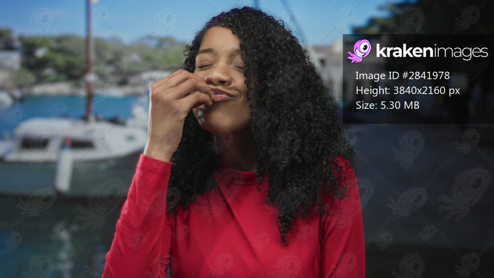 Woman in red shirt blows kiss at port dock standing by a moored boat under clear blue sky; affection and joy.