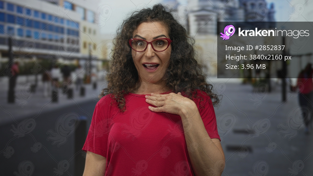 Woman in red shirt with curly hair and red glasses clutching chest on a busy city street with buildings blurred behind; surprise.