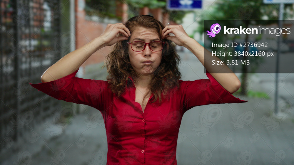 Woman in red shirt expressing emotion on city street with curly hair and glasses indicating surprise outdoors during daytime.