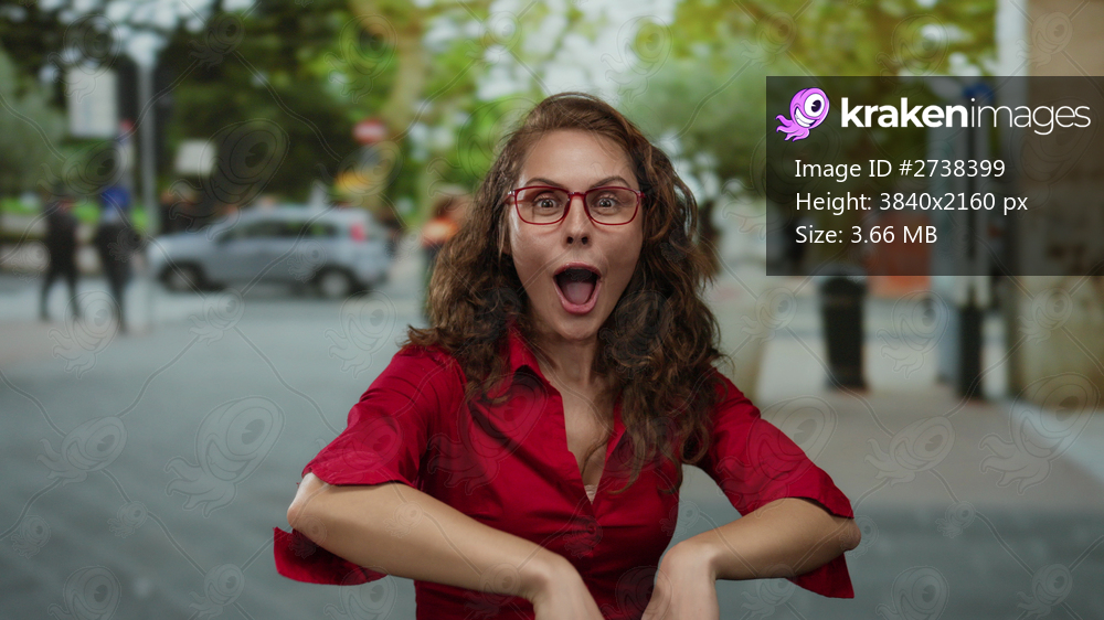 Woman in red shirt expressing surprise and joy on a bustling city street with blurred pedestrians and greenery in the background, showcasing urban vibrancy and emotion. - Kraken Images
