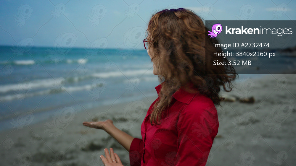 Woman in red shirt extends her hands at a seaside beach with turquoise water and sands, showcasing a joyful expression while embracing the natural outdoor environment. - Kraken Images