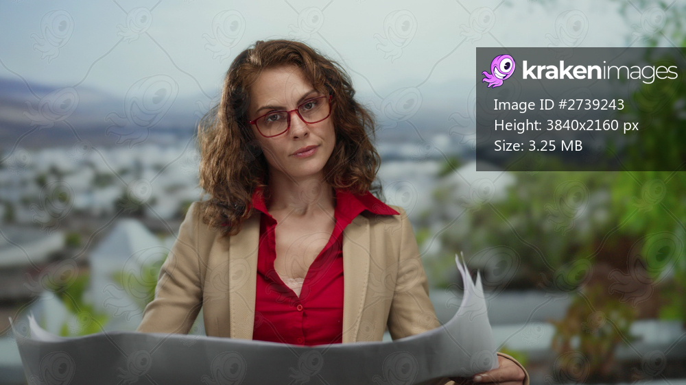 Woman in red shirt and glasses examines blueprints outdoors in a city setting with modern architecture and green landscape in the background.