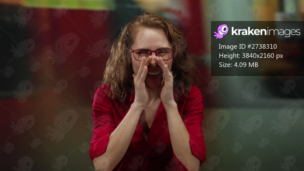 Woman in red shirt and glasses shouts with hands around mouth in vibrant urban outdoor setting