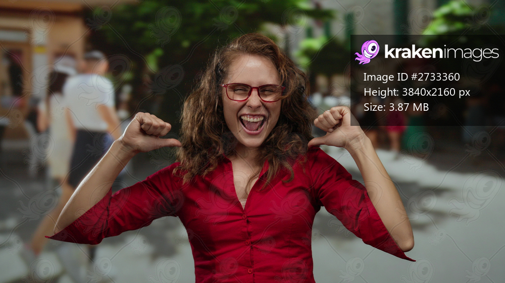 Woman in red shirt with glasses smiles confidently while pointing thumbs at herself on a bustling city street with blurred pedestrians in background.