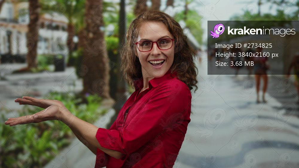 Woman in red shirt and glasses smiling and presenting while standing in a park pathway with palm trees and people in the background outdoors in daylight. - Kraken Images