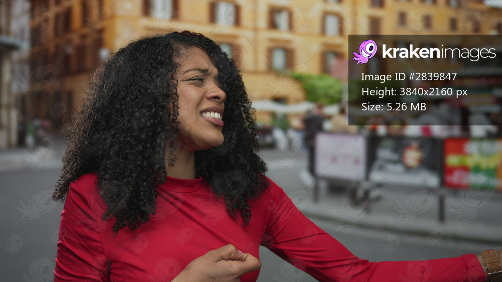 Woman in red shirt with hand gripping an unseen rope and making a pulling gesture on a crowded city street; determination.