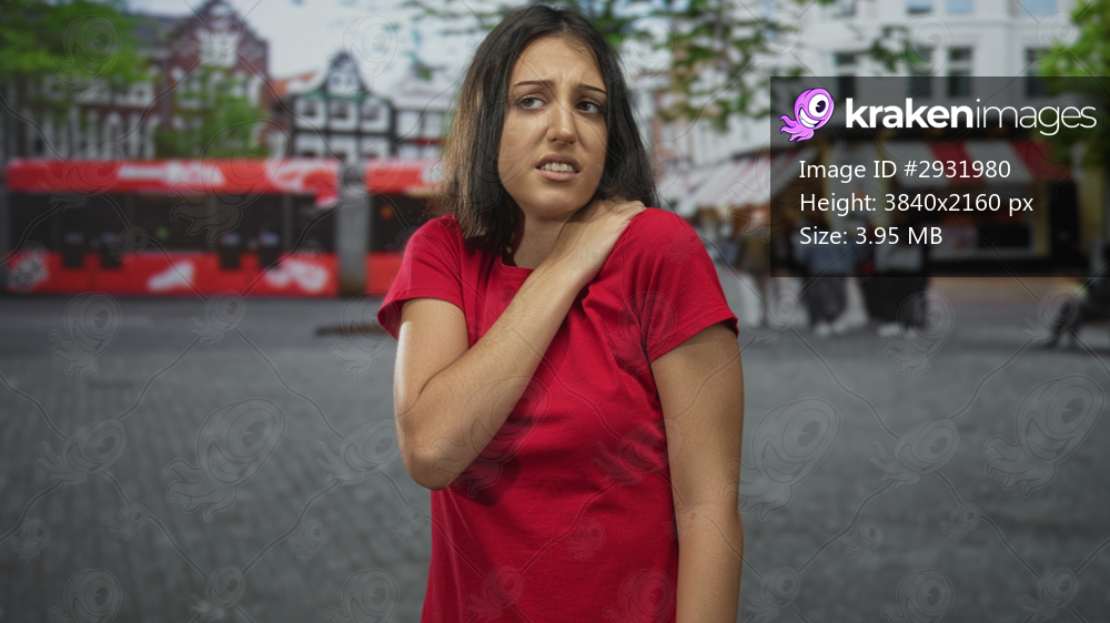 Woman in red shirt with hand on shoulder wincing while standing on city street near a red bus and cafes; pain recovery.