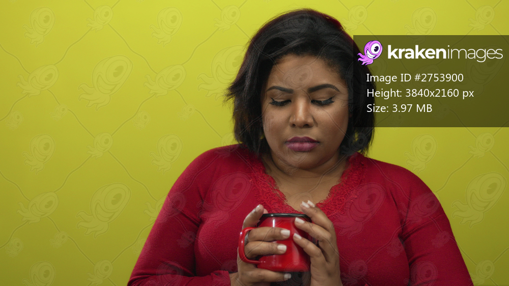 Woman in red shirt holding a coffee cup on a bright yellow background, conveying warmth and contemplation.