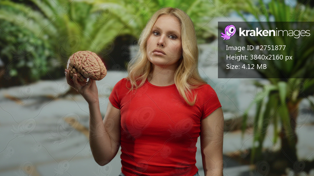 Woman in red shirt holding brain model in a lush green park, surrounded by trees, symbolizing knowledge and learning in a natural environment.