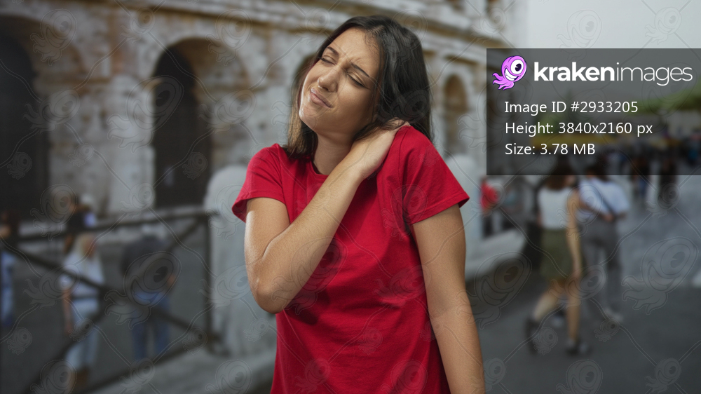 Woman in red shirt holding her neck and grimacing in front of the colosseum building, visible bare neck with neckache; discomfort.