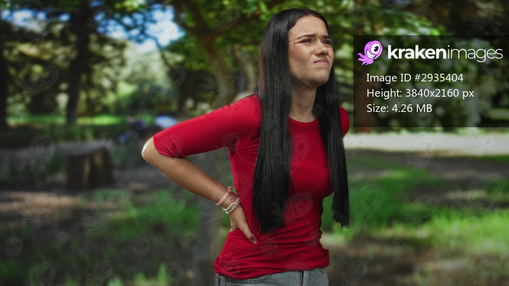Woman in red shirt holding lower back with one hand, grimacing and leaning slightly backward on a shaded forest path framed by trees and grass; pain.