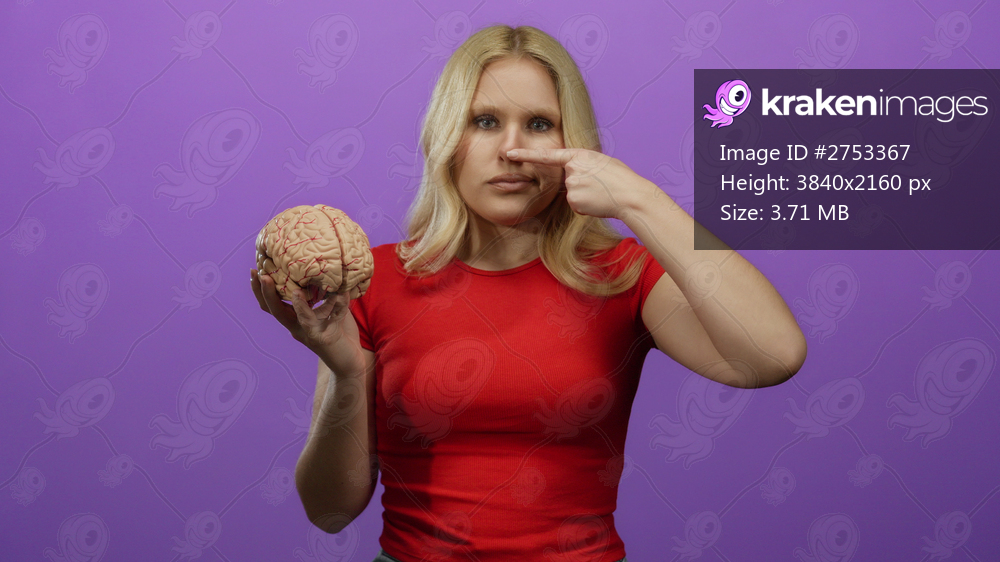 Woman in red shirt holds a brain model and touches her nose while standing against a purple background, highlighting focus and concentration themes.