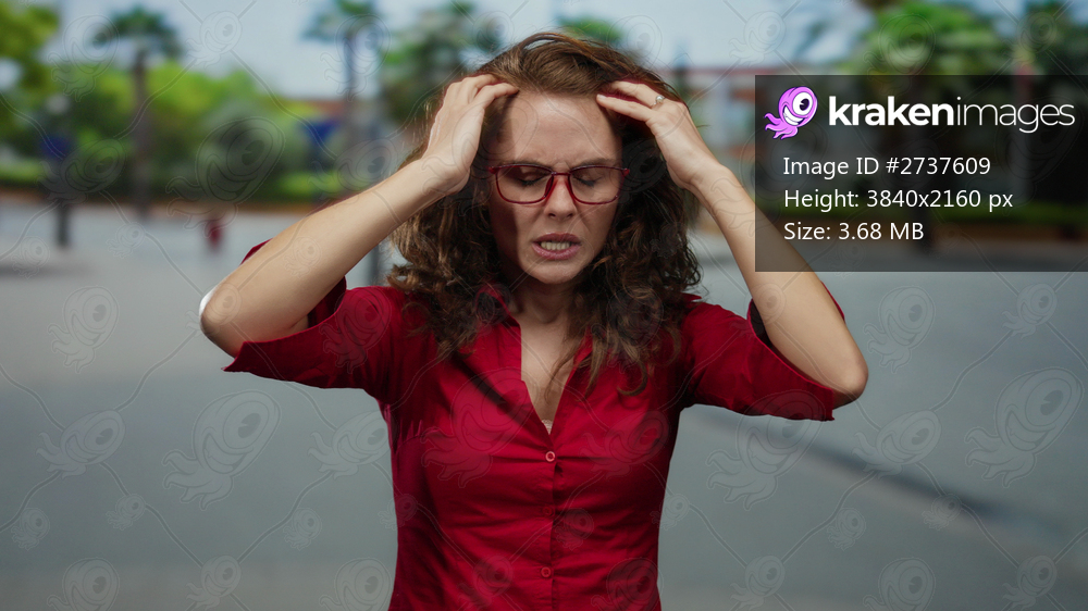 Woman in red shirt looks stressed on a city street surrounded by blurred green trees indicating an outdoor urban setting displaying youthful emotion and uncertainty evidence. - Kraken Images