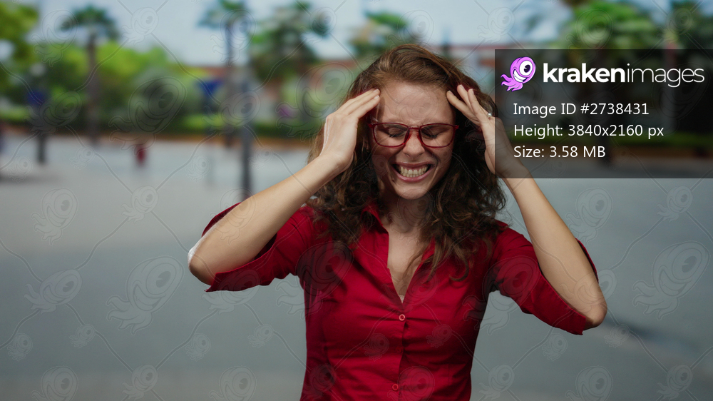 Woman in red shirt looks stressed on a city street surrounded by blurred green trees indicating an outdoor urban setting displaying youthful emotion and uncertainty evidence. - Kraken Images
