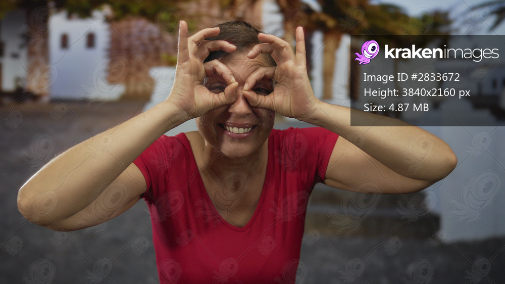 Woman in red shirt makes binocular hand gesture over her eyes in a sunlit old town street; curiosity discovery wonder exploration.