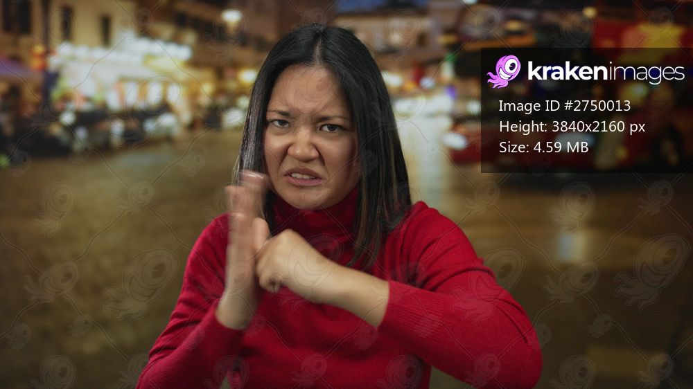 Woman in red shirt making expressive gestures in a city street at night, showing varied emotions related to a confrontation outdoors.