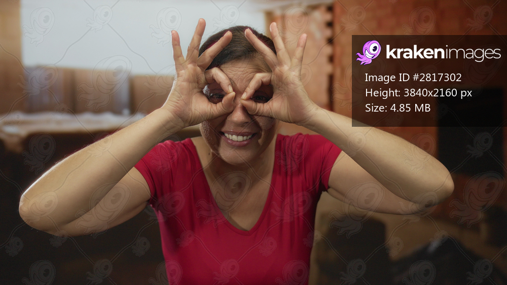 Woman in red shirt making hand binoculars gesture while smiling in building interior at construction site; curiosity.