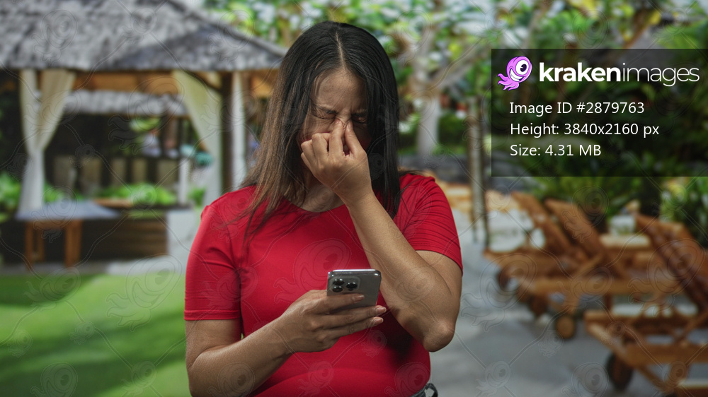 Woman in red shirt pinches nose while holding smartphone beside lounge chairs at a building courtyard; disgust.