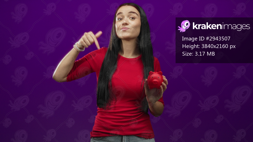 Woman in red shirt points finger at red piggy bank while holding it in hand against purple studio backdrop; financial optimism.