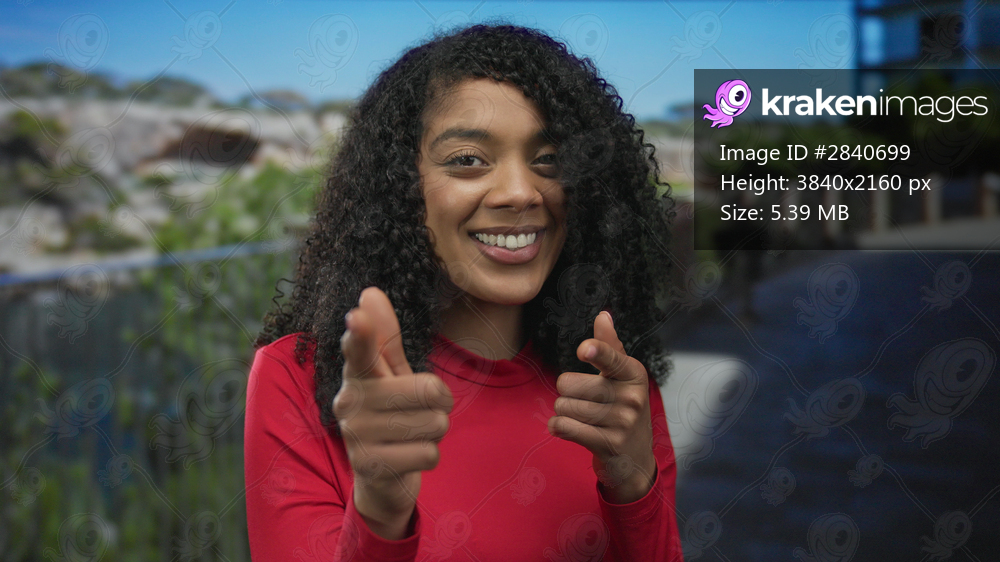 Woman in red shirt points finger to camera beside fence on paved walkway in sunlit park; playfulness.