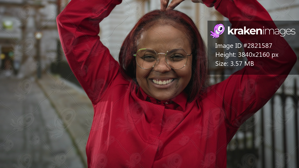 Woman in red shirt smiling broadly makes heart shape above head with hands on city street during daylight; love.