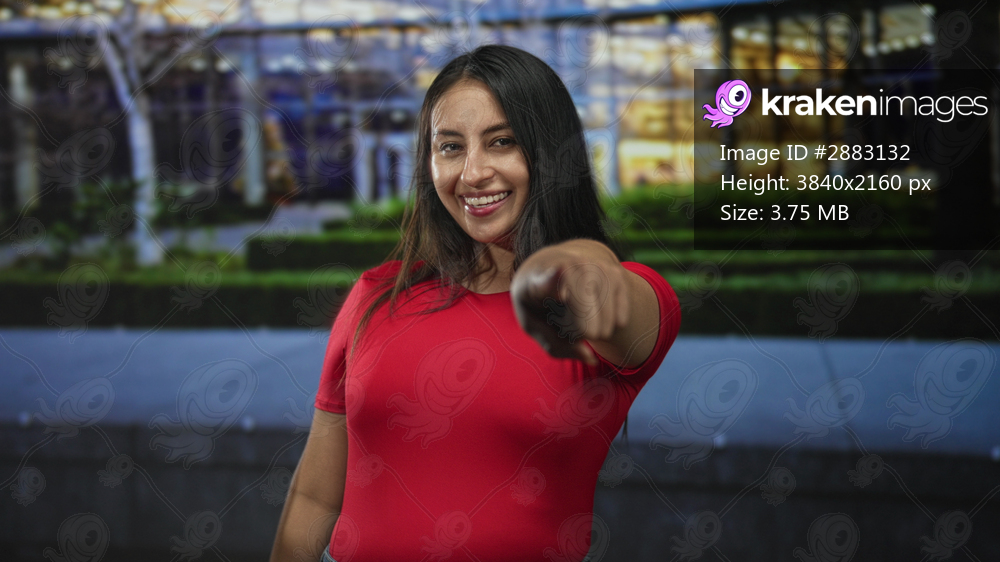 Woman in red shirt smiling, finger pointing to camera outside modern glass building at night; confidence empowerment connection.