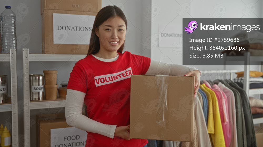 Woman in red shirt smiling holding box in charity donation center with shelves of food and clothes showcasing indoor volunteer work.