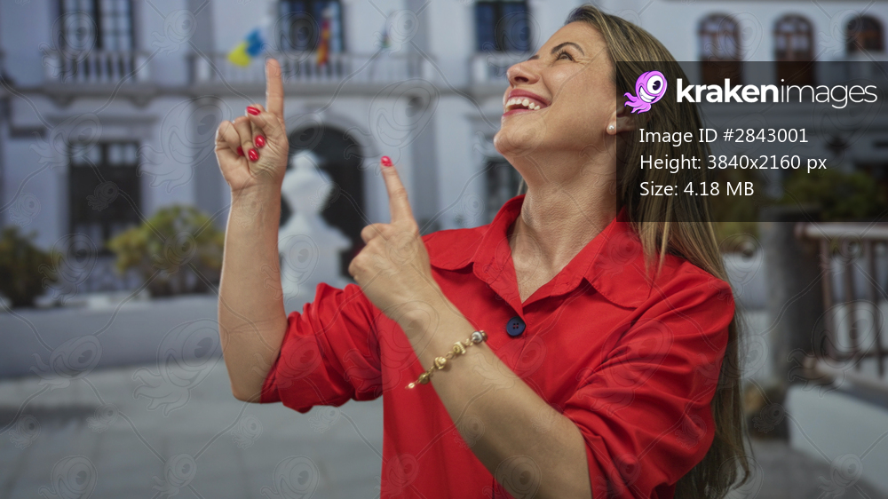 Woman in red shirt smiling and pointing finger to white building facade in street; aspiration optimism.