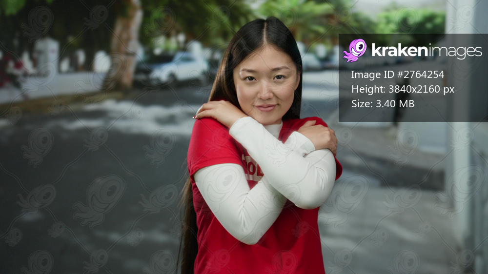 Woman in red shirt standing on a quiet city street embracing herself with eyes closed, showcasing peaceful expression in an urban outdoor setting with trees and parked cars. - Kraken Images