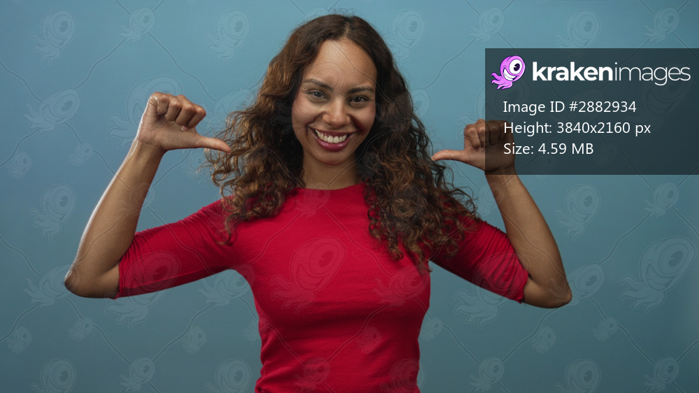 Woman in red shirt thumbs pointing to herself in blue studio showing smile and curly hair, frontal pose; self confidence.