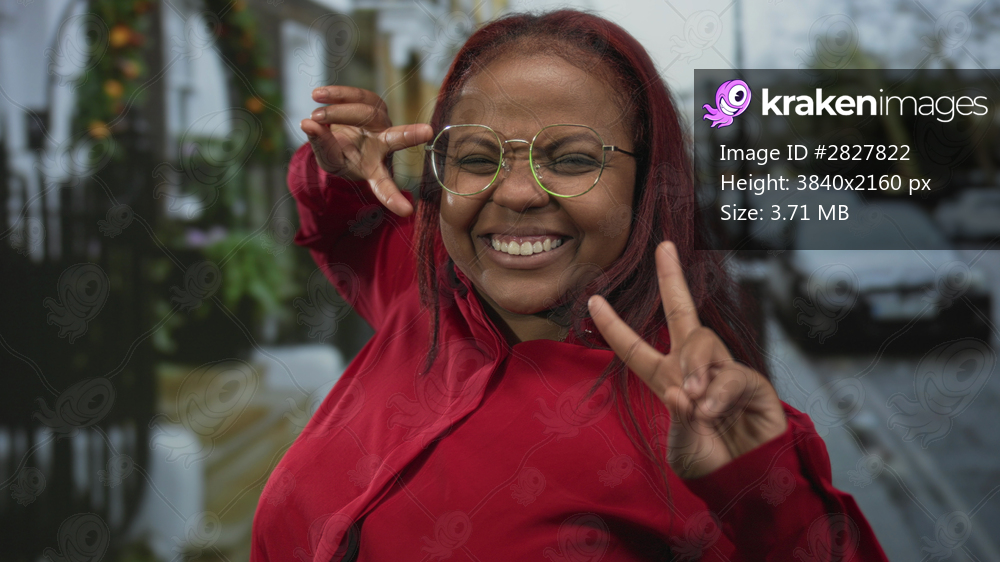 Woman in red shirt wearing glasses making peace sign with smiling face on street; celebration happiness.