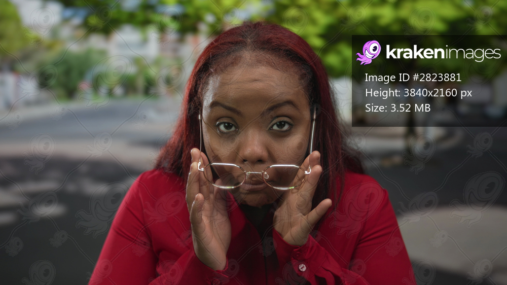 Woman in red shirt wearing glasses pressing hands to cheeks in surprise on city street; astonishment.