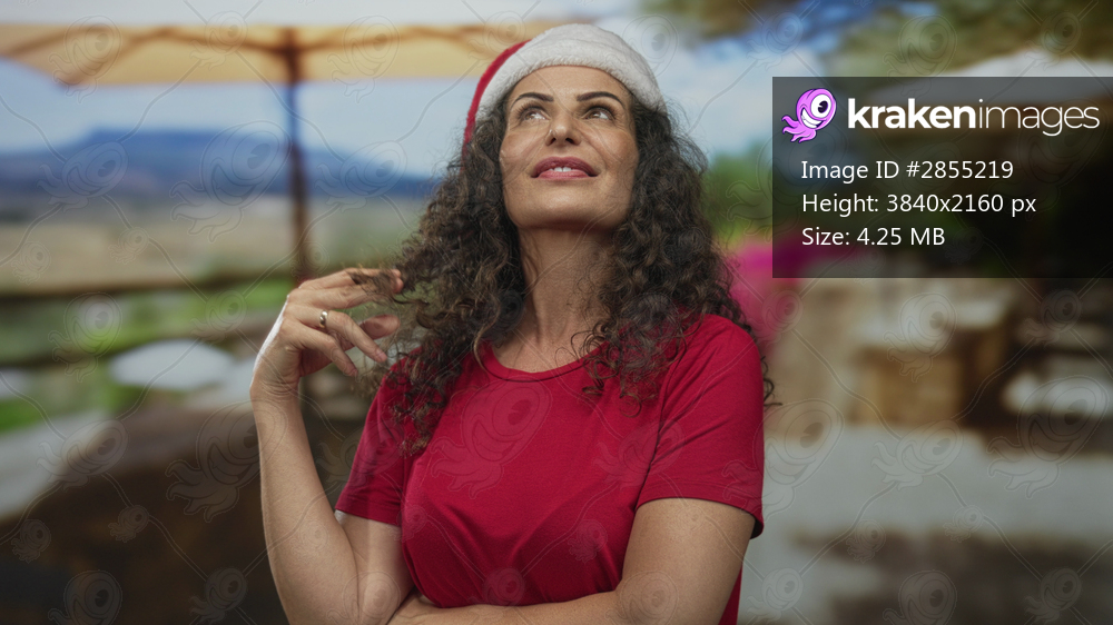 Woman in red shirt wearing santa hat smiling and touching hair at street cafe; holiday cheer festive spirit.