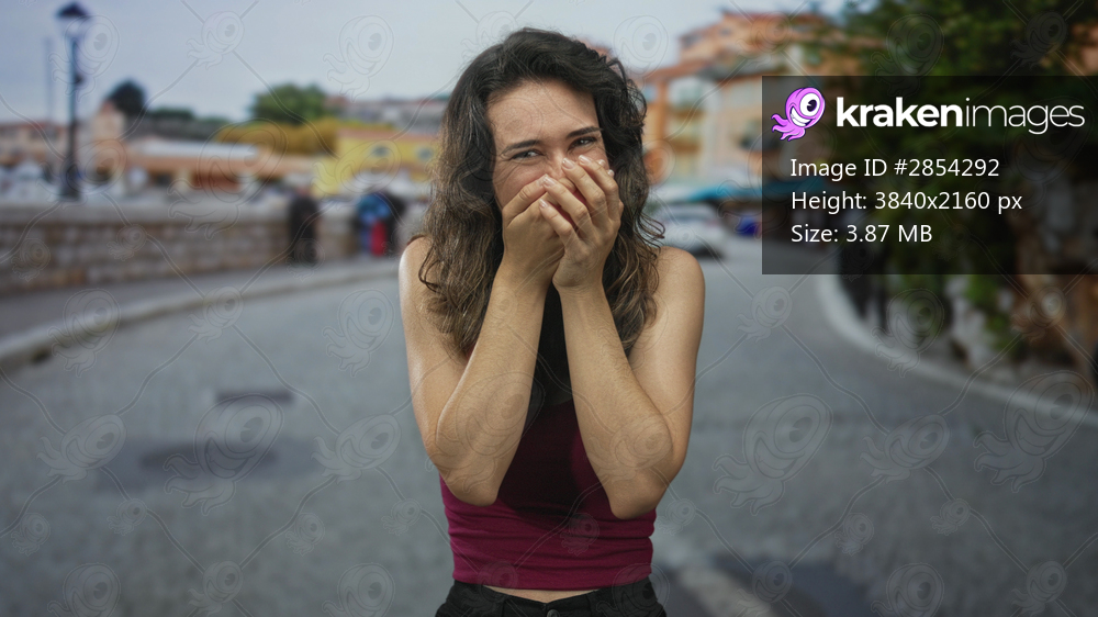 Woman in red sleeveless top with hands clasped smiling on cobblestone street in town square; happiness.