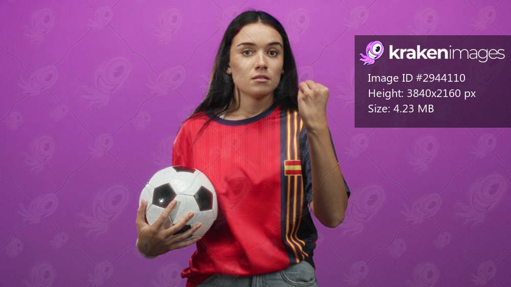 Woman in red spanish jersey holds soccer ball and makes questioning hand gesture in studio; team spirit frustration.