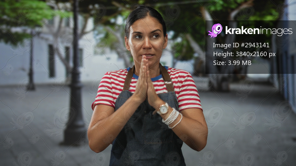 Woman in red striped shirt and denim apron pressing palms together in street near lamppost and trees; hope.