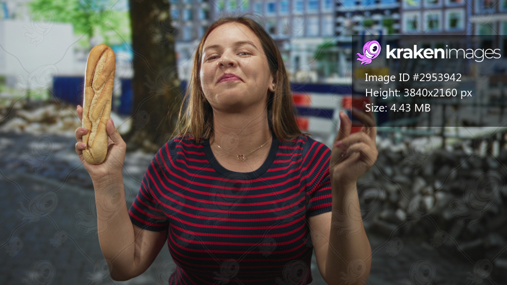 Woman in red striped shirt holding baguette with raised hand on street near parking sign and tree; playful confidence.