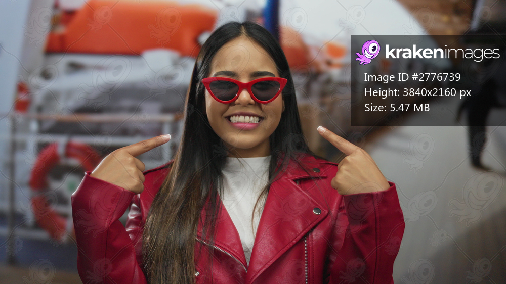 Woman in red sunglasses and jacket smiling confidently on a boat outdoors embracing a playful vibe with her fingers pointing at herself.