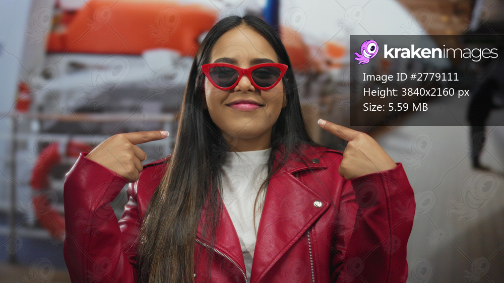 Woman in red sunglasses and jacket smiling confidently on a boat outdoors embracing a playful vibe with her fingers pointing at herself.