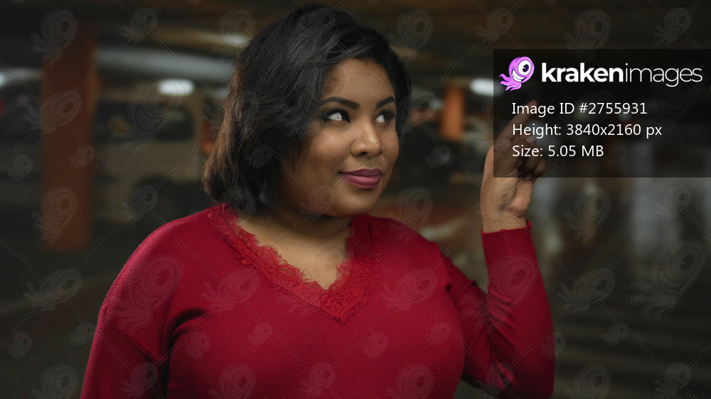 Woman in red sweater confidently pointing while standing inside a dimly lit indoor parking lot, evoking a sense of direction and purpose.