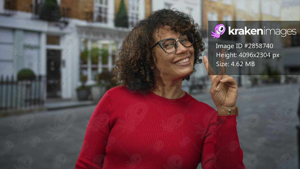 Woman in red sweater with curly hair and eyeglasses holds peace sign and smiles on urban street; optimism.