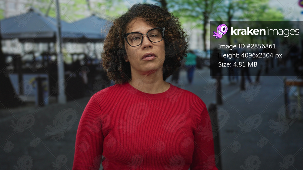 Woman in red sweater and glasses fans face with hands on crowded city street near sidewalk cafe and trees; relief cooling.