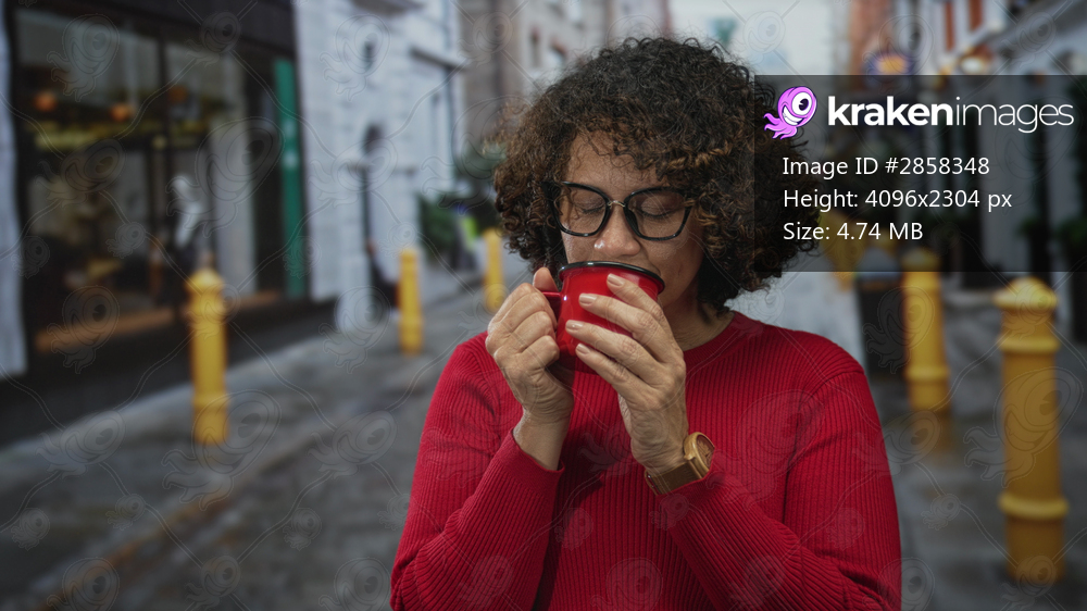 Woman in red sweater holds ceramic mug to nose on cobblestone urban street with yellow bollards and boutique shop windows; serenity.