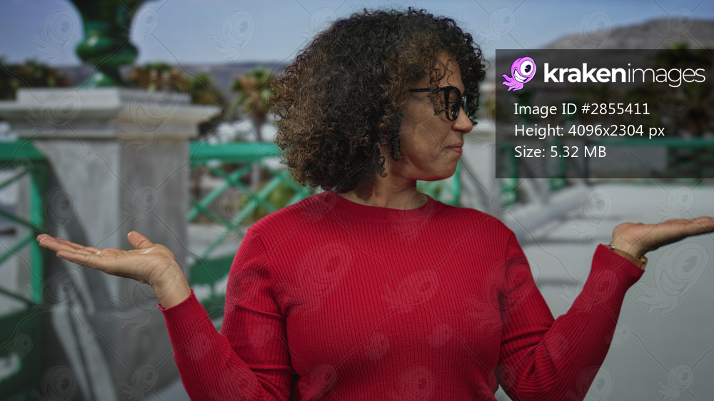 Woman in red sweater holds hands out palm up and tilts head with closed eyes on street outdoors; uncertainty.