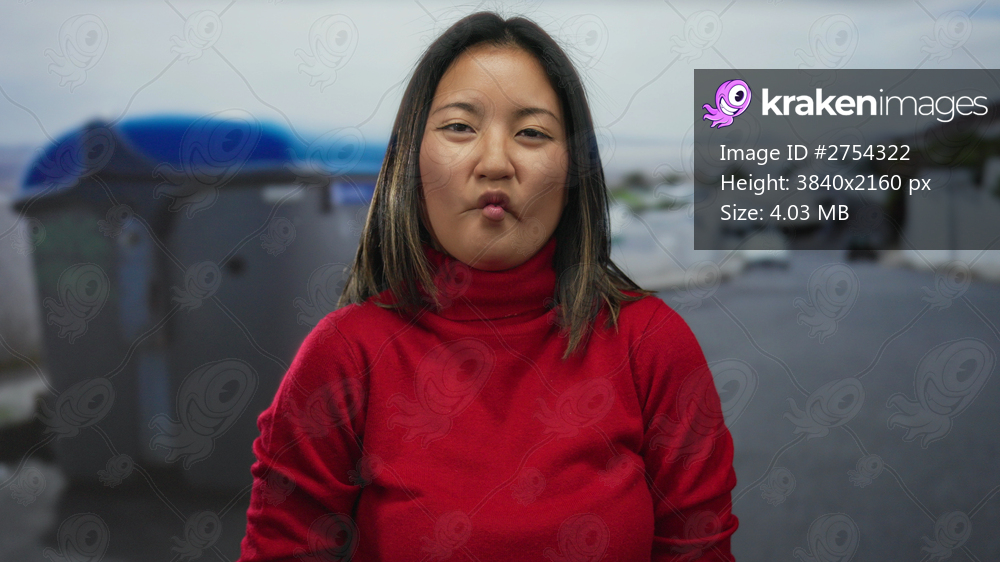 Woman in red sweater making faces outdoors in urban street setting with bins in background giving playful expression showcasing modern city life.