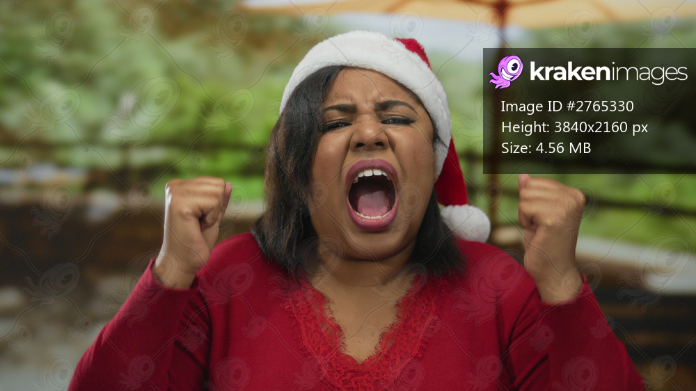 Woman in red sweater and santa hat shows frustration and excitement in a blurred outdoor park setting, expressing strong emotions with both hands raised and a lively facial expression. - Kraken Images