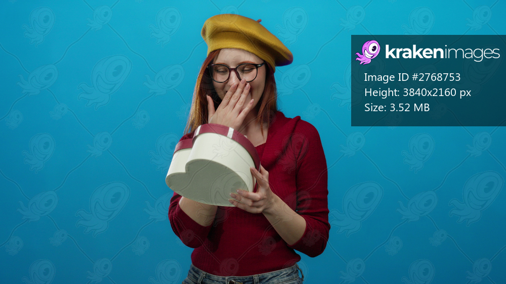 Woman in red sweater and yellow beret holding a heart-shaped gift box with a joyful expression against a vibrant blue background showcasing delight and surprise. - Kraken Images
