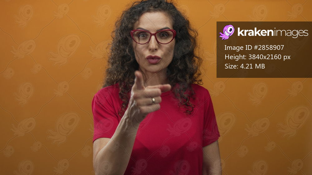 Woman in red t shirt wearing red glasses pointing finger at viewer in studio shot with orange backdrop; confidence.